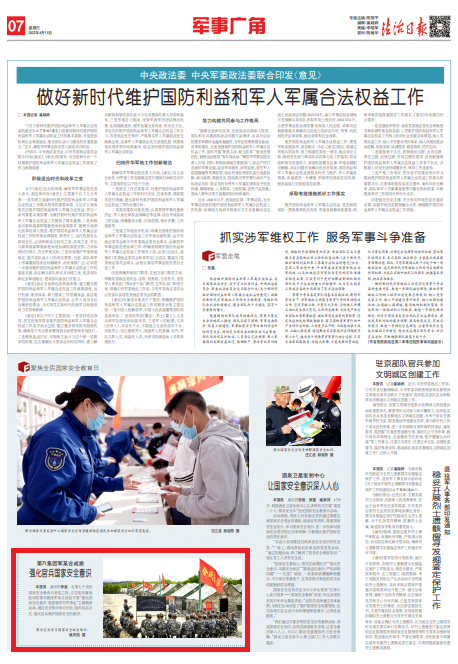 本報(bào)訊 通訊員李政 在第七個(gè)全民國家安全教育日來臨之際,正在皖東腹地駐訓(xùn)的第71集團(tuán)軍某合成旅開展“強(qiáng)化國家安全意識(shí) 推進(jìn)強(qiáng)軍興軍偉業(yè)”主題教育活動(dòng),通過安全常識(shí)學(xué)習(xí)討論、組織簽名儀式,強(qiáng)化官兵維護(hù)國家安全的意識(shí)。