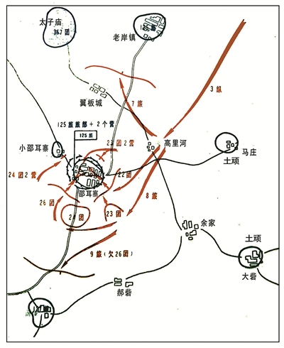 晉冀魯豫野戰(zhàn)軍第3縱隊(duì)接到戰(zhàn)斗命令后,要求各部隊(duì)迅速行動(dòng),直插邵耳寨附近的指定位置,向敵第125旅發(fā)起進(jìn)攻。具體部署為:第8旅(配屬第9旅第26團(tuán))擔(dān)負(fù)攻打邵耳寨的任務(wù);第7旅在黃村寨、謝家城一線占領(lǐng)陣地,阻擊南援之?dāng)?,并?dān)任預(yù)備隊(duì);第9旅(欠第26團(tuán))在張王寨集、大沙邱一線占領(lǐng)陣地,阻擊北援之?dāng)臣胺罃惩粐?/p>