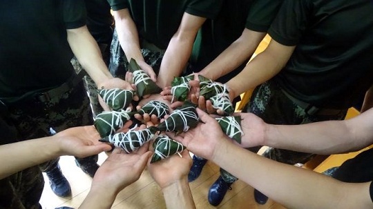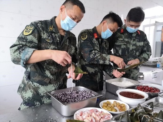 傍晚,結束任務的執(zhí)法員們在餐廳自己動手包粽子。“這是我第一次學著包粽子,雖然包得奇形怪狀,但是我覺得特別有意義?!眻?zhí)法員小李笑著說。