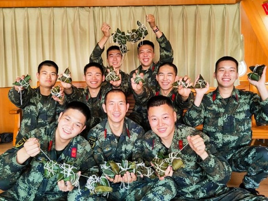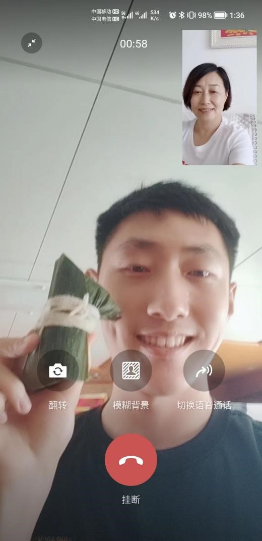 和媽媽撥通了視頻的執(zhí)法員小王高興地炫耀著手里的粽子:“媽媽,端午安康,不用擔心我,我在這邊一切都好,你看這是我自己包的粽子。”