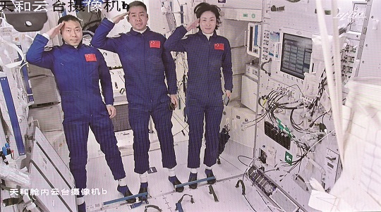 圖為6月5日進(jìn)駐天和核心艙的航天員陳冬(中)、劉洋(右)和蔡旭哲向全國人民敬禮的畫面。新華社記者李鑫 攝