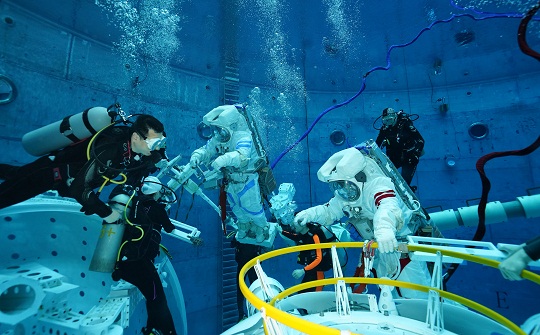 圖為劉洋和蔡旭哲進(jìn)行空間站任務(wù)水下訓(xùn)練??追街?攝