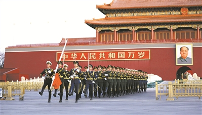 每天,伴著晨曦,解放軍儀仗大隊官兵在天安門廣場升起國旗,為祖國和人民迎接黎明。黃昏時分,年輕的軍人們穿過天安門城樓券門時唱起:我把青春融進(jìn)祖國的江河……