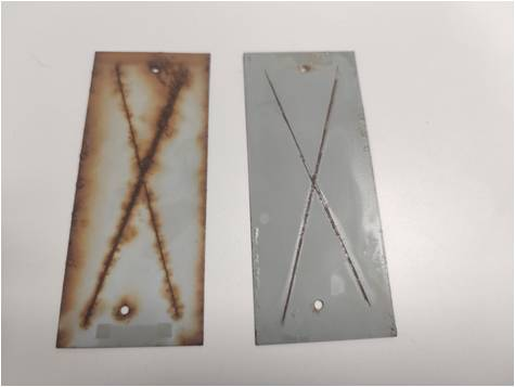 圖為高溫高濕自然環(huán)境下放置12個(gè)月的金屬表面,右為刷涂YJ-13金屬防銹液的金屬表面。
