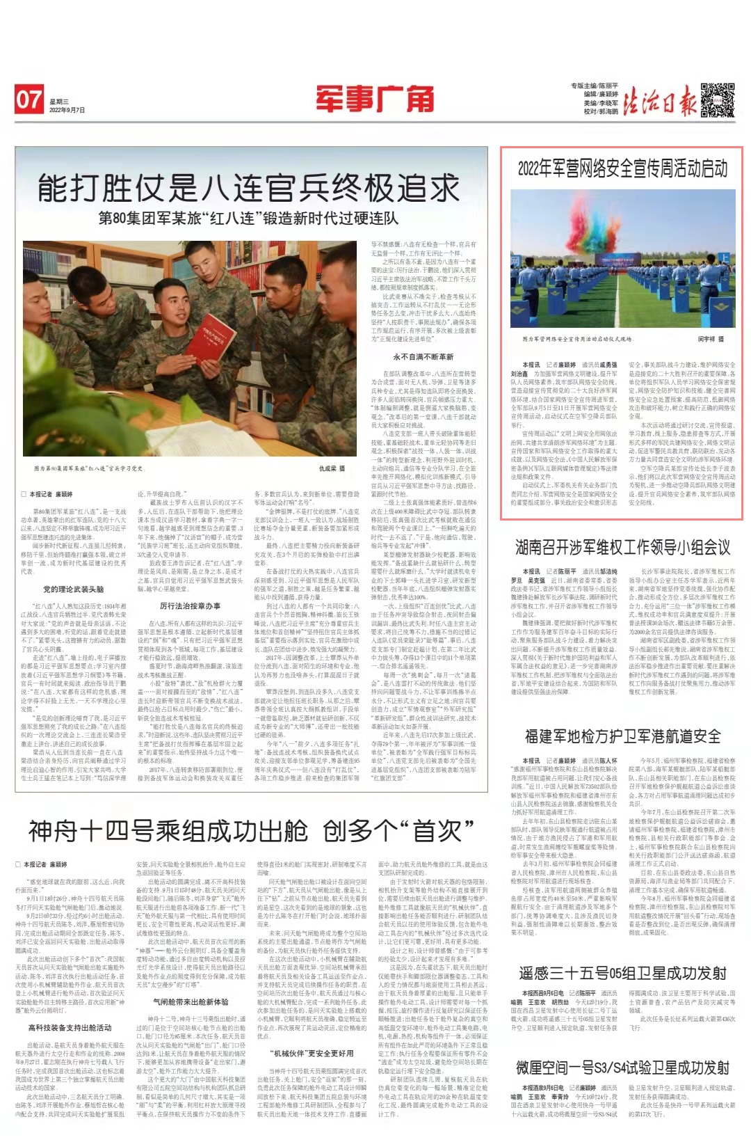 本報訊 記者廉穎婷 通訊員戚勇強 劉治鑫 羅健 閔宇祥 任強盛 為加強軍營網(wǎng)絡(luò)文明建設(shè),提升軍隊人員網(wǎng)絡(luò)素養(yǎng),筑牢部隊網(wǎng)絡(luò)安全防線,營造迎接宣傳貫徹黨的二十大良好涉軍網(wǎng)絡(luò)環(huán)境,結(jié)合國家網(wǎng)絡(luò)安全宣傳周進軍營,全軍部隊9月5日至11日開展軍營網(wǎng)絡(luò)安全宣傳周活動,啟動儀式在空軍空降兵部隊舉行。