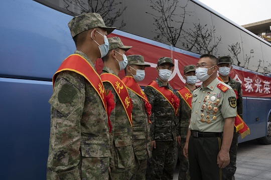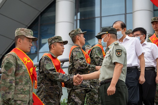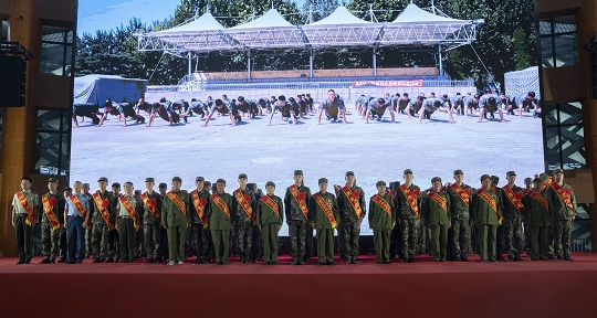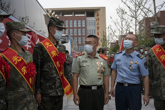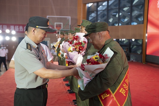 圖為革命功臣和立功現(xiàn)身軍人代表為新兵壯行。
