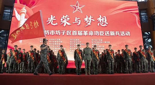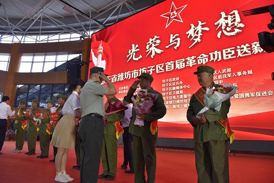 圖為山東省濰坊市坊子區(qū)首屆革命功臣送新兵活動現(xiàn)場。
