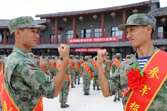 圖為即將奔赴軍營(yíng)的新兵們正在相互加油。