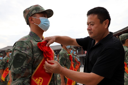 圖為一名家長(zhǎng)整理新兵胸前紅花。