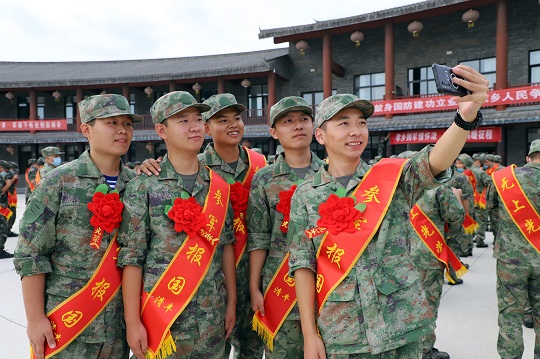 圖為即將奔赴軍營(yíng)的新兵正在用手機(jī)自拍合影留念。