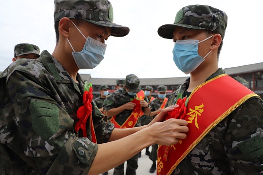 圖為入伍新兵幫助對(duì)方扎好“光榮入伍”綬帶。