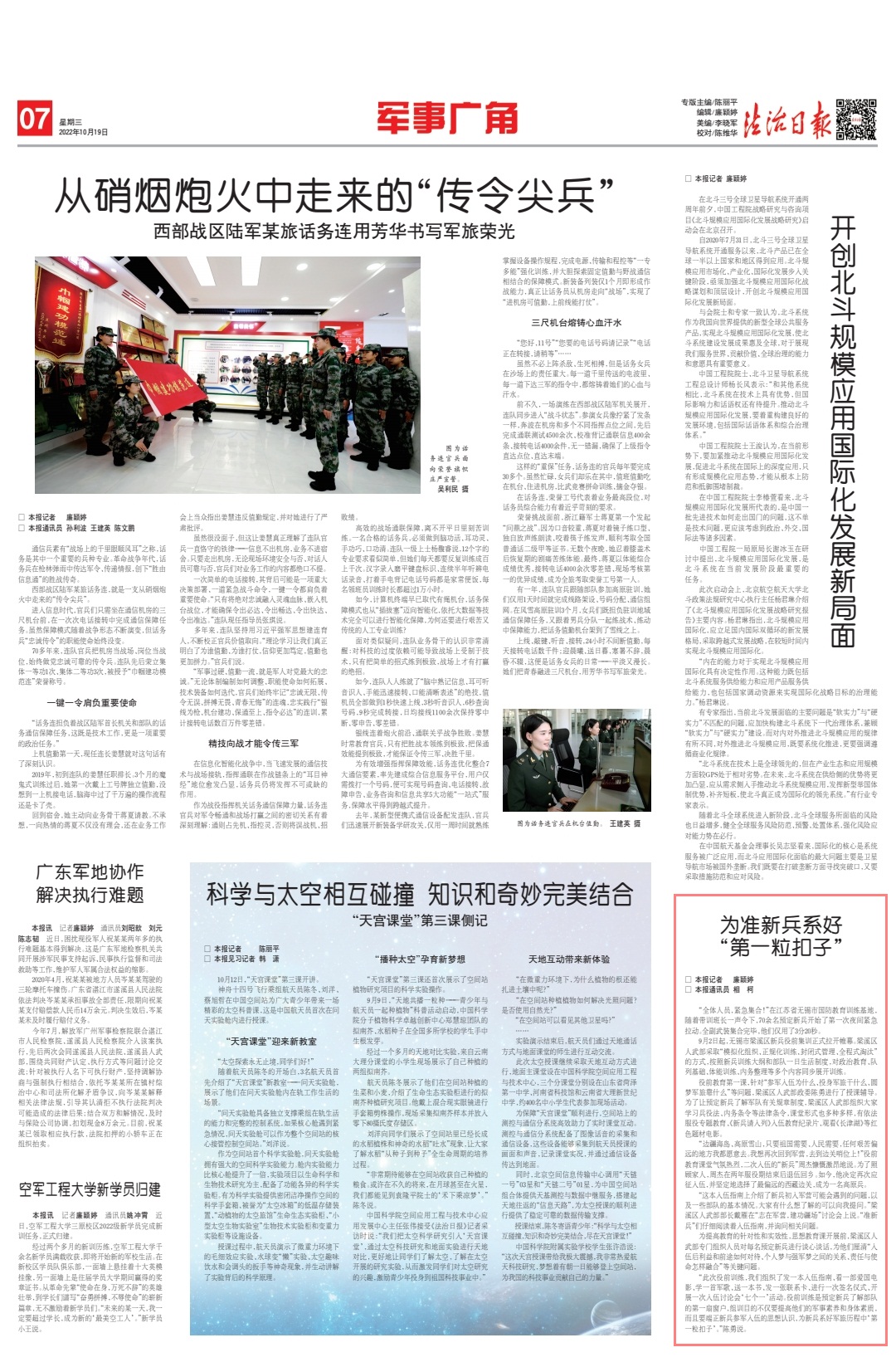 “此次役前訓練,我們組織了發(fā)一本入伍指南、看一部愛國電影、學一首軍歌、送一本書、發(fā)一張聯(lián)系卡、進行一次簽名儀式、開展一次入伍討論會‘七個一’活動。役前訓練是預定新兵了解部隊的第一扇窗戶,組訓目的不僅要提高他們的軍事素養(yǎng)和身體素質,而且要端正新兵參軍入伍的思想認識,為新兵系好軍旅歷程中‘第一粒扣子’?!标愑抡f。