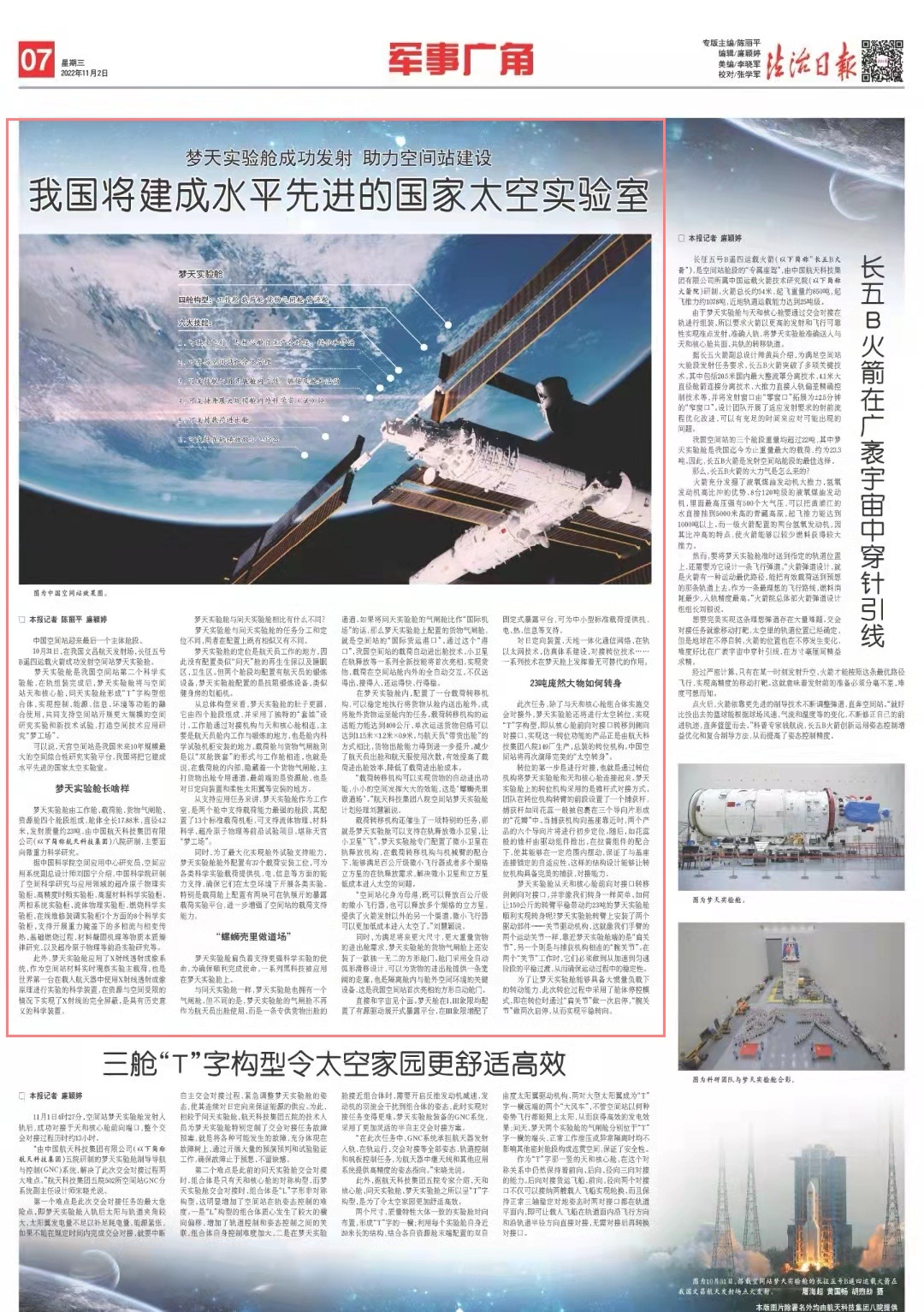 夢天實驗艙是我國空間站第二個科學實驗艙,在軌組裝完成后,夢天實驗艙將與空間站天和核心艙、問天實驗艙形成“T”字構(gòu)型組合體,實現(xiàn)控制、能源、信息、環(huán)境等功能的融合使用,共同支持空間站開展更大規(guī)模的空間研究實驗和新技術(shù)試驗,打造空間技術(shù)應用研究“夢工場”。