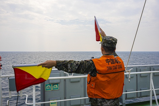 圖為中國(guó)海警4304艦執(zhí)法員在中越聯(lián)合巡航期間使用信號(hào)旗對(duì)船只進(jìn)行引導(dǎo)。