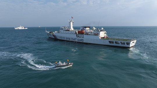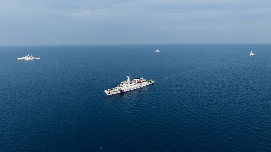 圖為中國(guó)海警4304艦艇編隊(duì)與越南海警8004艦艇編隊(duì)協(xié)同開展海上搜救演練。