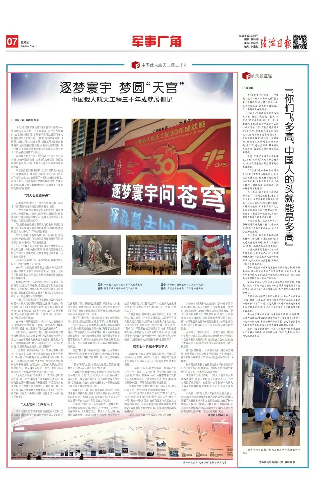 從藍(lán)圖繪夢到奮斗圓夢,幾代中國航天人經(jīng)過三十年接續(xù)奮斗,建成自主建造、獨立運行的“天宮”空間站,成功突破掌握了一系列關(guān)鍵核心技術(shù),創(chuàng)造了重大飛行任務(wù)27戰(zhàn)27捷的輝煌戰(zhàn)績,在建設(shè)航天強(qiáng)國、攀登科技高峰的征程上又增添了一座彪炳史冊的“里程碑”。