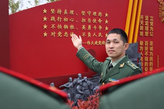 圖為武警工程大學(xué)學(xué)員萬鴻玥在武警安徽總隊合肥支隊史館父親萬四海的雕像旁緬懷追思。徐偉 攝