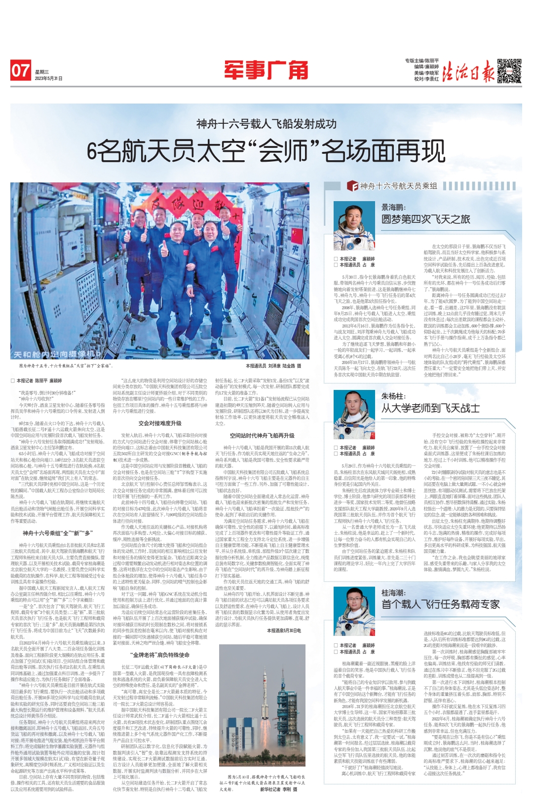 神舟十六號(hào)航天員乘組由1名首批航天員和2名第三批航天員組成。其中,航天駕駛員景海鵬和航天飛行工程師朱楊柱來(lái)自航天員大隊(duì),主要負(fù)責(zé)直接操縱、管理航天器,以及開展相關(guān)技術(shù)試驗(yàn)。載荷專家桂海潮是北京航空航天大學(xué)的一名教授,主要負(fù)責(zé)空間科學(xué)實(shí)驗(yàn)載荷的在軌操作,在科學(xué)、航天工程等領(lǐng)域受過(guò)專業(yè)訓(xùn)練且具有豐富操作經(jīng)驗(yàn)。