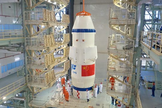 圖為神舟十五號(hào)載人飛船船罩組合體吊裝。本報(bào)通訊員 高楠拍 攝