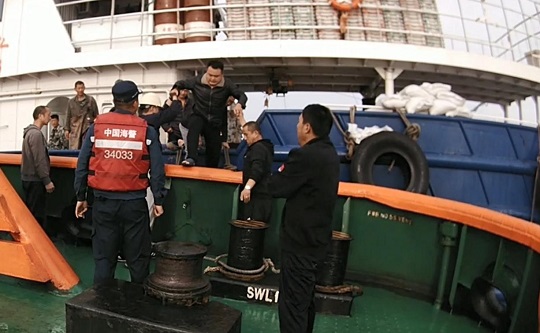 圖為海警執(zhí)法員指揮現(xiàn)場船舶救助掉海船員。