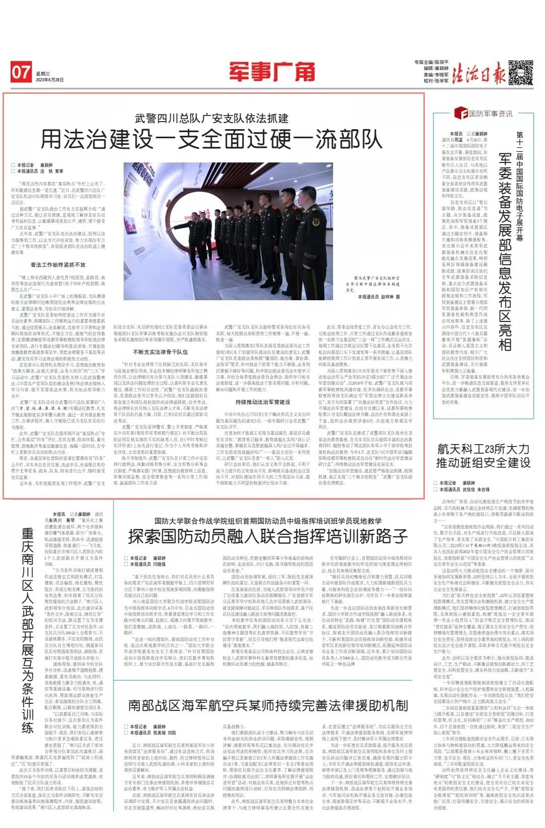 武警廣安支隊還建成了武警部隊支隊級單位首家法治教育基地,在為本支隊官兵提供豐富的法治教育同時,輻射帶動了周邊部隊和鄧小平干部學院等駐地機構法治教育。今年4月,該支隊與《中國軍法》編輯部和成都軍事檢察院成功合辦“新時代法治軍營建設研討會”,持續(xù)推動法治軍營建設走深走實。