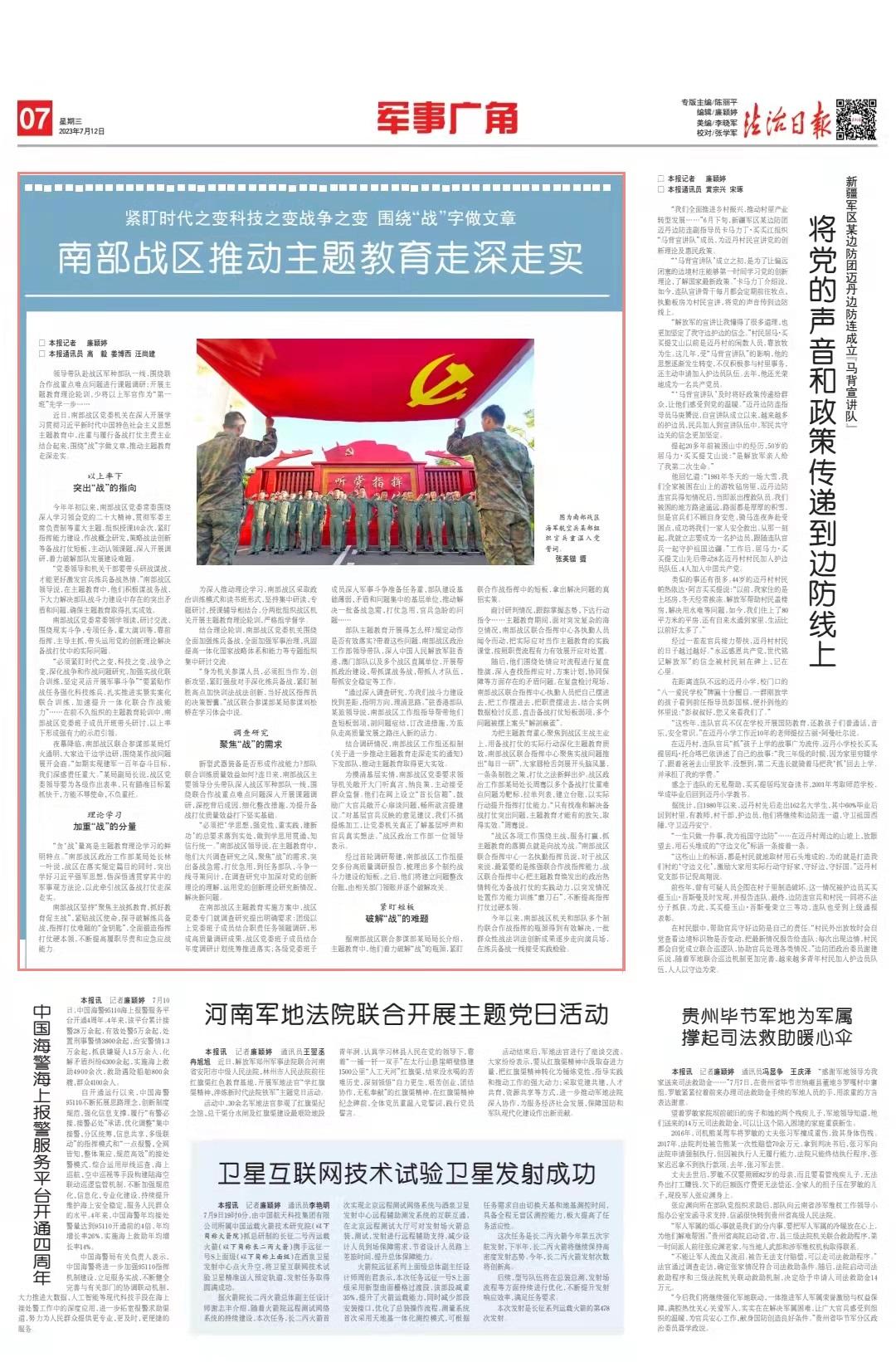 在南部戰(zhàn)區(qū)主題教育實施方案中,戰(zhàn)區(qū)黨委專門就調查研究提出明確要求:團級以上黨委班子成員結合職責任務領題調研,形成高質量調研成果,戰(zhàn)區(qū)黨委班子成員結合年度調研計劃統(tǒng)籌推進落實;各級黨委班子成員深入軍事斗爭準備任務重、部隊建設基礎薄弱、矛盾和問題集中的基層單位,推動解決一批備戰(zhàn)急需、打仗急用、官兵急盼的問題……
