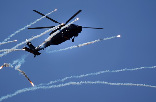 圖為陸軍“風(fēng)雷”飛行表演隊(duì)直-20戰(zhàn)術(shù)通用直升機(jī)發(fā)射干擾彈。張永進(jìn) 攝