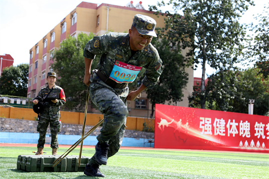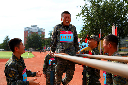 “各就位,預(yù)備,嘭……”伴隨著發(fā)令槍響,4×400米接力賽開始。參賽官兵猶如離弦之箭迅速?zèng)_出起跑線,第一棒官兵低頭猛沖,接棒官兵焦急回望,觀賽官兵吶喊助威,現(xiàn)場(chǎng)氛圍緊張熱烈。與此同時(shí),各競(jìng)賽課目相繼展開,20×60米考驗(yàn)團(tuán)隊(duì)協(xié)作和速度;徒手、負(fù)重組合考驗(yàn)爆發(fā)力和協(xié)調(diào)力;器械課目考驗(yàn)技能技巧和官兵耐力……