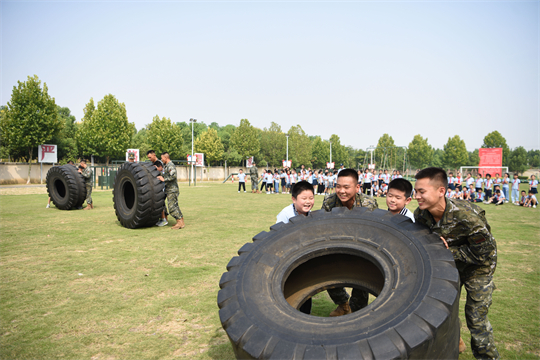 圖為在武警合肥支隊(duì)執(zhí)勤某大隊(duì)營區(qū),小學(xué)生與戰(zhàn)士們組隊(duì)進(jìn)行翻輪胎比賽。