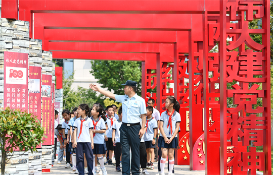 圖為在武警合肥支隊(duì)執(zhí)勤某大隊(duì)營區(qū),小學(xué)生在參觀黨史軍史長廊。