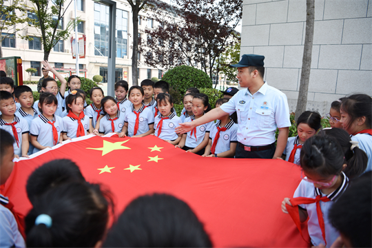 圖為在武警合肥支隊(duì)執(zhí)勤某大隊(duì)營區(qū),文職人員王帝在向小學(xué)生介紹國旗知識。