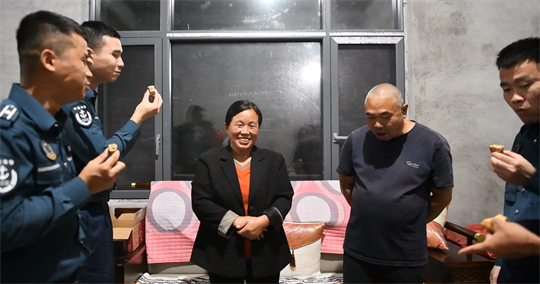 “叔叔,這邊天氣逐漸轉(zhuǎn)涼了,您要注意保暖?!薄笆迨灏⒁?,我們是想陪你們共度中秋節(jié),這是來之前執(zhí)法員們手工做的雙黃白蓮蓉月餅,非常地好吃?!焙>瘓?zhí)法員詢問汪曉龍父母的困難,同時(shí)帶去廣東海警全體執(zhí)法員對(duì)他們的問候。
