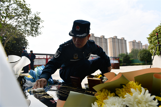 隨后,海警執(zhí)法員趕赴太和縣萬壽山烈士紀(jì)念碑廣場(chǎng),汪曉龍烈士的墓碑安放在這里。