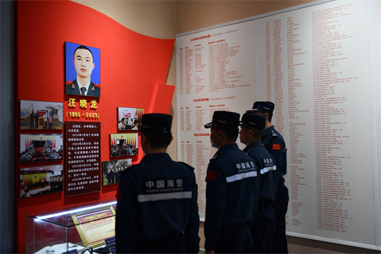“這位是汪曉龍烈士,是我們阜陽太和人,生前是廣東海警局執(zhí)法員?!痹谔涂h烈士紀(jì)念館里,講解員講述著汪曉龍生前的先進(jìn)事跡,在場(chǎng)人員聆聽著英烈事跡,看著館里展陳的汪曉龍烈士生前的遺物和工作照片,往事一幕幕浮現(xiàn)在廣東海警執(zhí)法員腦海中。