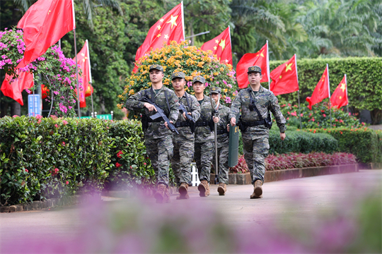 9月30日,國慶中秋“雙節(jié)”放假期間,擔(dān)負(fù)城市武裝巡邏任務(wù)的武警海南總隊??谥ш牴俦冀K堅守在執(zhí)勤一線,他們在商圈、公園、城市主干道等重點部位巡邏警戒,確保駐地安全穩(wěn)定。