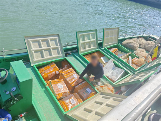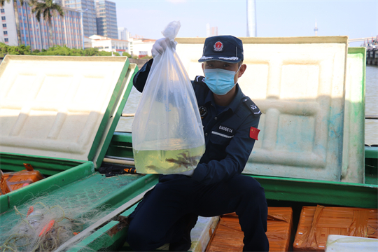 經(jīng)查,船上共有船員2名,該涉案船舶無(wú)船名船號(hào),貨艙暗格里發(fā)現(xiàn)載有龍蝦、巨骨舌魚(yú)苗等。經(jīng)清點(diǎn),活體龍蝦共95箱約1500公斤,巨骨舌魚(yú)苗約1000條,現(xiàn)場(chǎng)人員均無(wú)法提供貨物合法來(lái)源證明,海警執(zhí)法員依法將涉案船只及貨物帶回作進(jìn)一步調(diào)查處理。