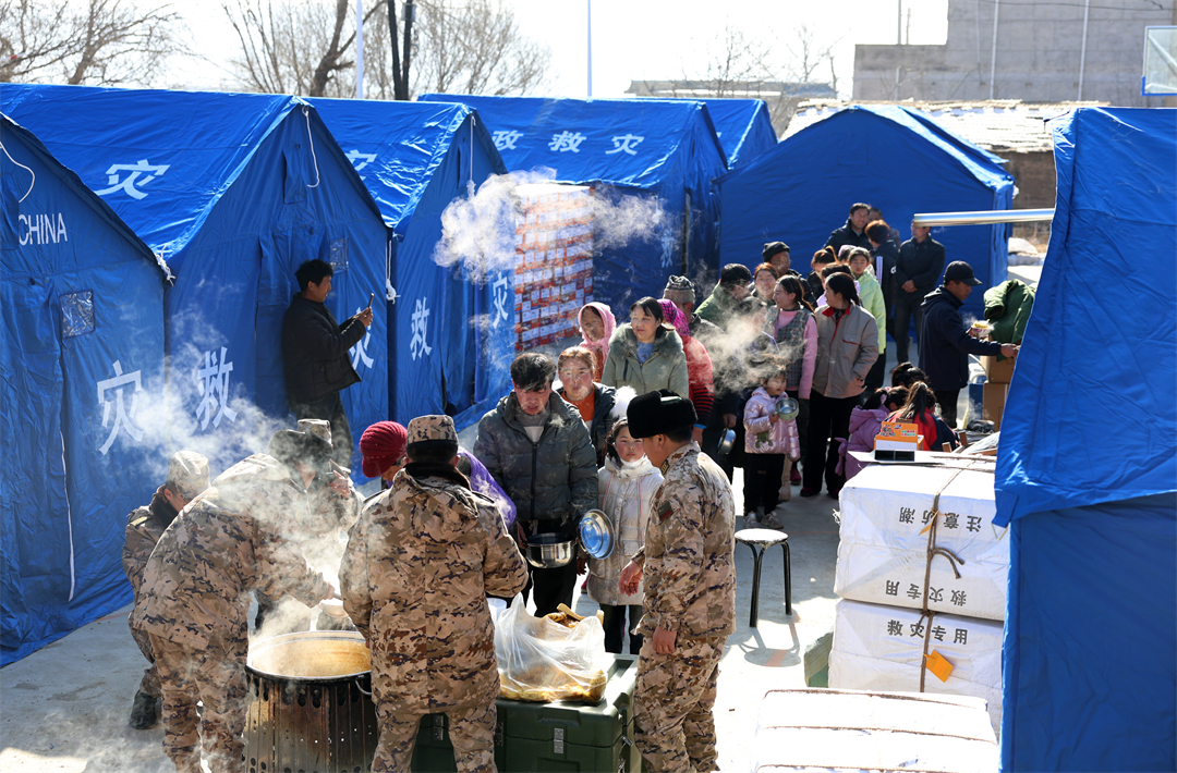 12月21日中午,武警甘肅總隊(duì)臨夏支隊(duì)官兵在積石山縣劉集鄉(xiāng)陽(yáng)屲村受災(zāi)群眾安置點(diǎn)搭帳篷、送物資,利用野戰(zhàn)給養(yǎng)單元為群眾制作熱食。群眾說(shuō):“人民軍隊(duì)愛(ài)人民,謝謝你們的關(guān)心!”