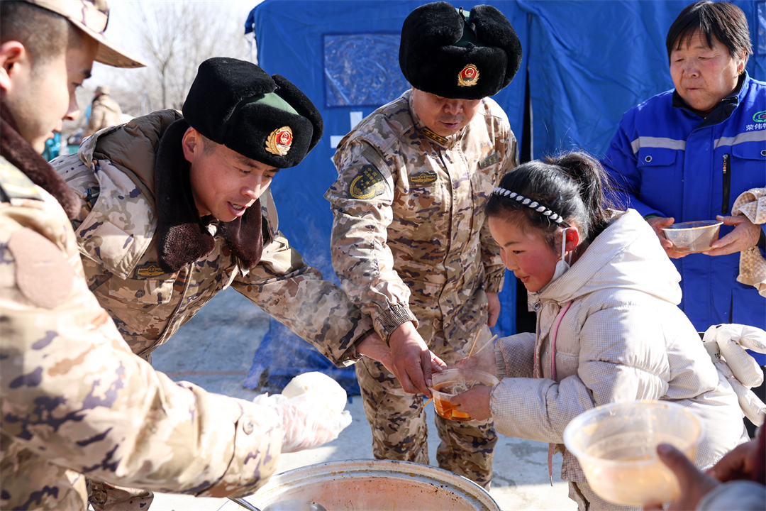 圖為12月21日,武警甘肅總隊(duì)臨夏支隊(duì)官兵在積石山縣劉集鄉(xiāng)陽(yáng)屲村為受災(zāi)群眾供應(yīng)熱食。