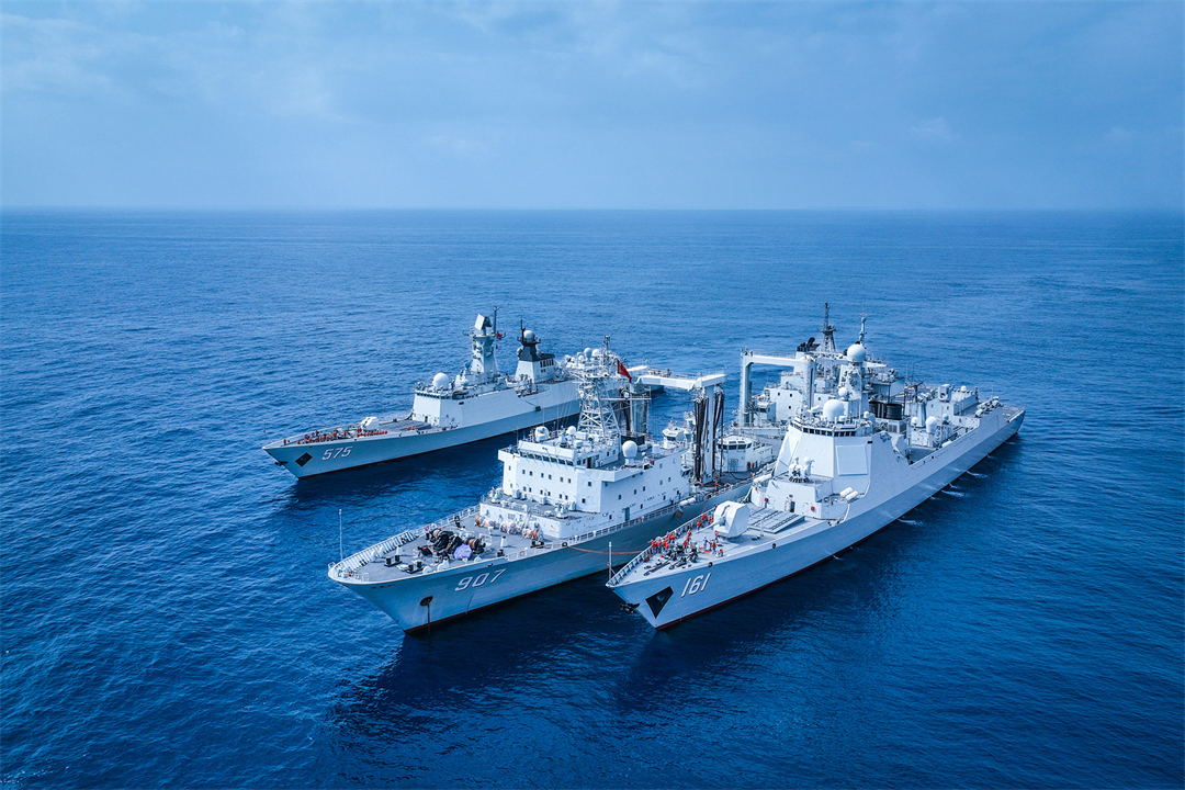 圖為2022年2月27日,第40批護(hù)航編隊(duì)利用任務(wù)間隙,在亞丁灣西部某海域組織開展錨泊并靠補(bǔ)給,綜合補(bǔ)給艦駱馬湖艦向各艦輸送油、水、食品等物資,為完成后續(xù)任務(wù)打下基礎(chǔ)。胡韋楠 楊捷 攝