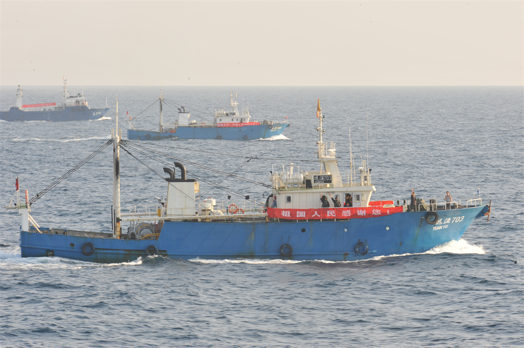 圖為今年10月22日,第45批護(hù)航編隊(duì)烏魯木齊艦、東平湖艦為10艘中國漁船進(jìn)行護(hù)航。王遠(yuǎn)方 攝