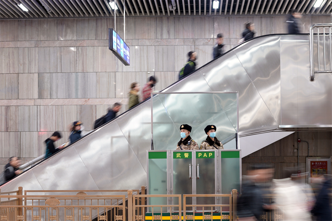 圖為北京西站地下通道內(nèi)兩名武警官兵在認(rèn)真執(zhí)勤。