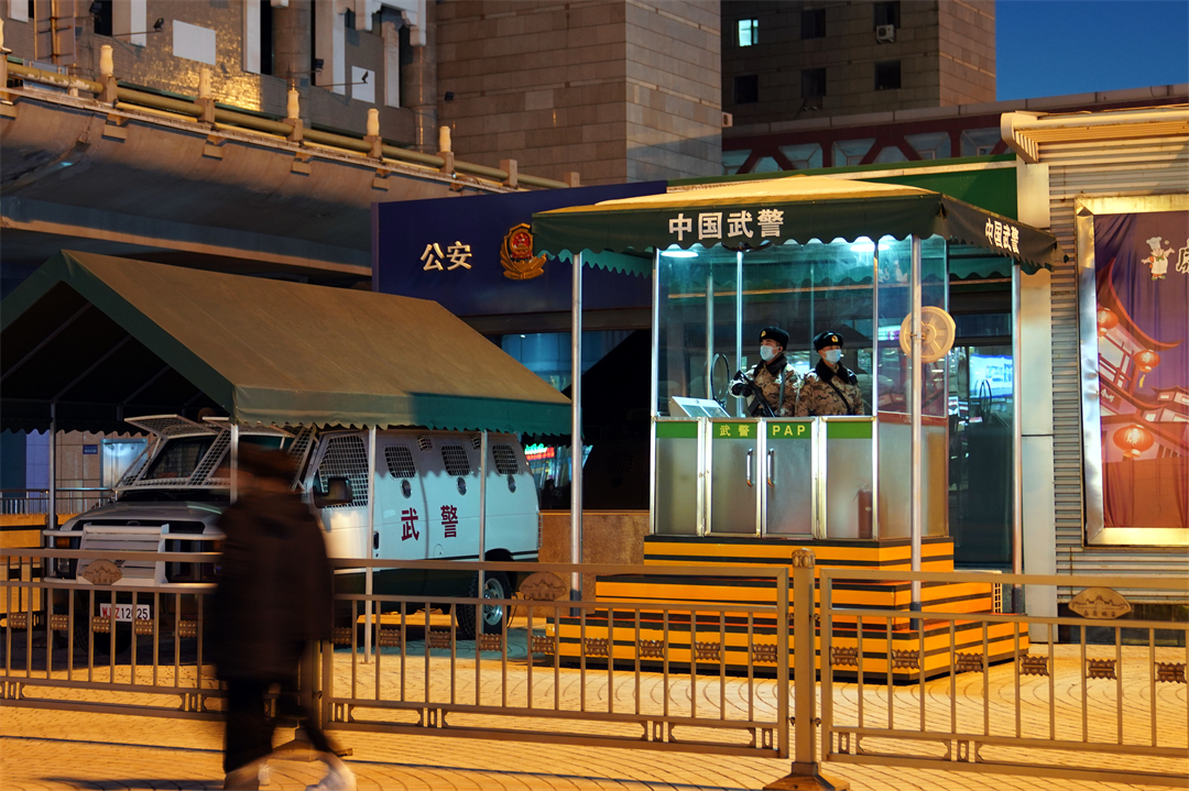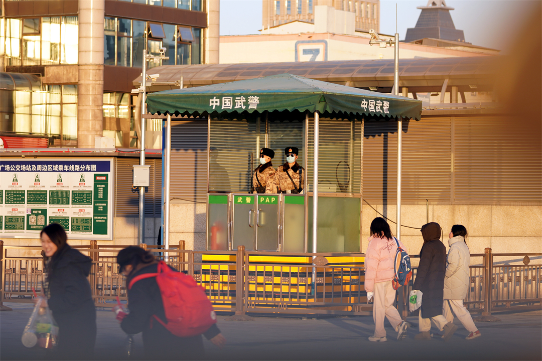 圖為北京西站南廣場(chǎng)武警正在認(rèn)真履職。