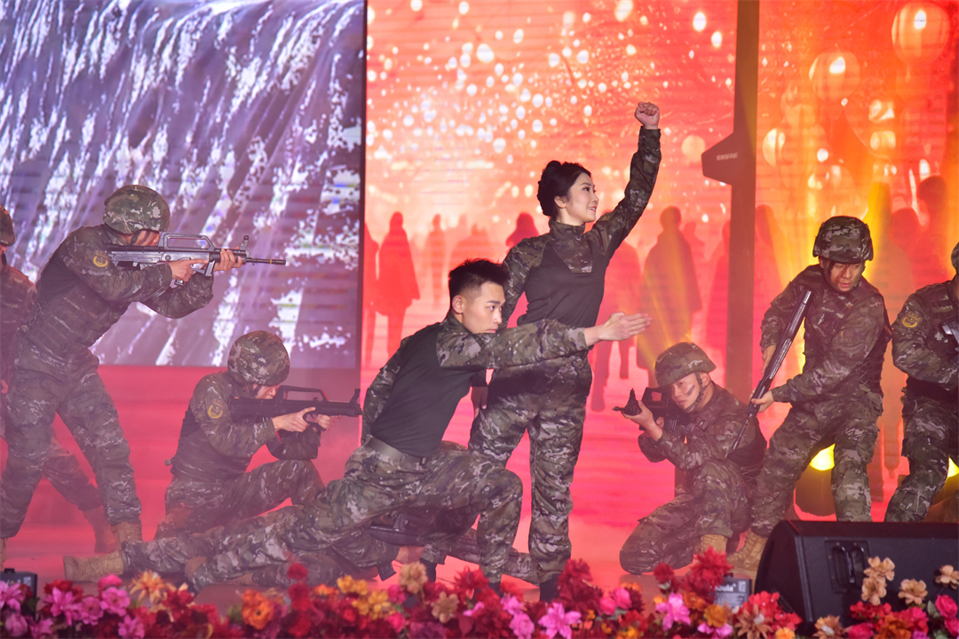 “血脈里奔騰著紅色基因,戰(zhàn)旗上銘刻著不變的軍魂……”晚會在全場大合唱《向著強大的現代化武警部隊前進》中落下帷幕。