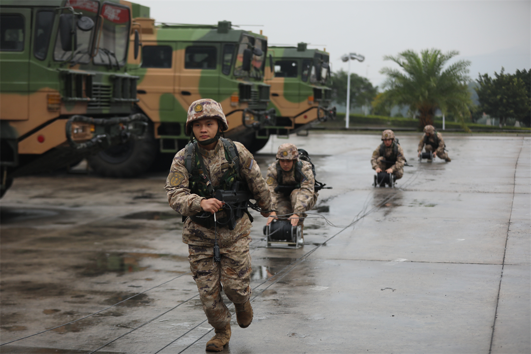 圖為東部戰(zhàn)區(qū)海軍某團(tuán)組織突擊群指揮員資質(zhì)認(rèn)證考核,號(hào)手快速鋪設(shè)光纜。付琪皓 攝