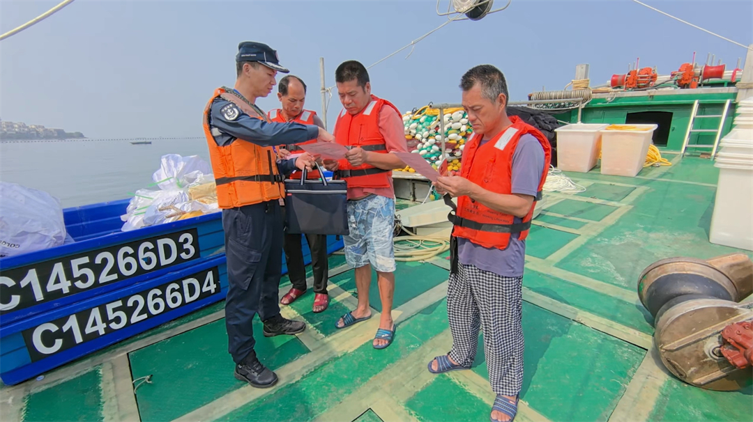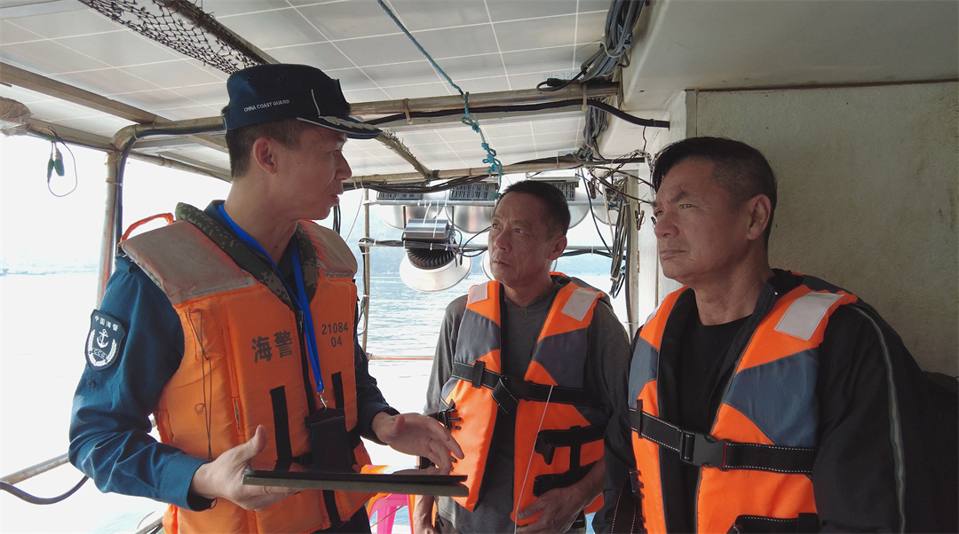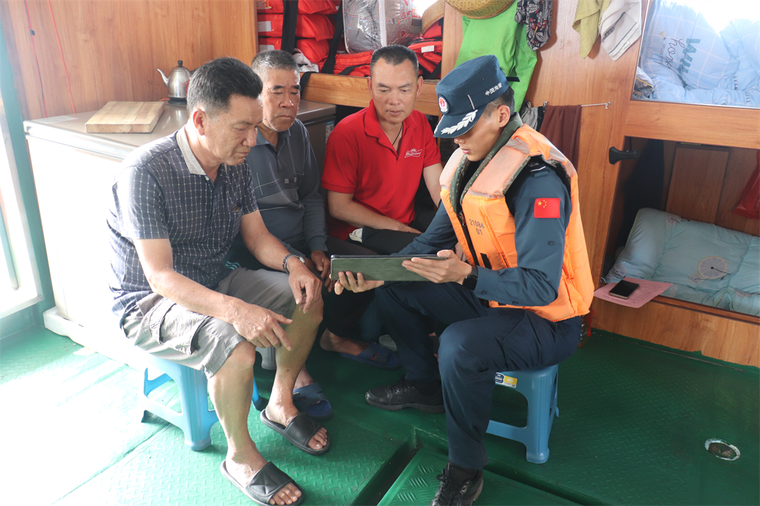 圖為執(zhí)法員向漁船民講解國(guó)家安全相關(guān)知識(shí)。