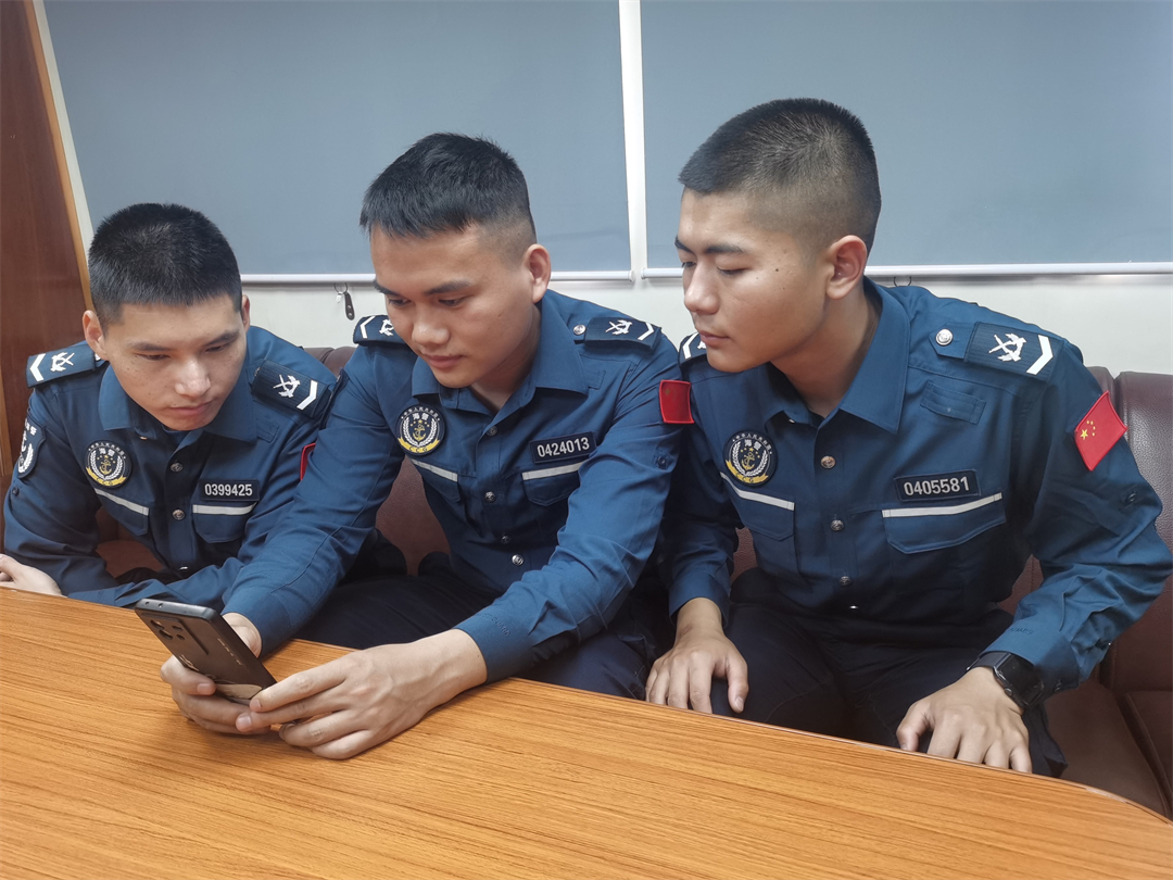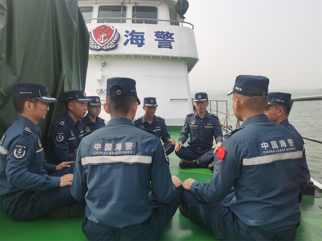 圖為執(zhí)法員正在甲板上進(jìn)行國(guó)家安全主題討論交流。
