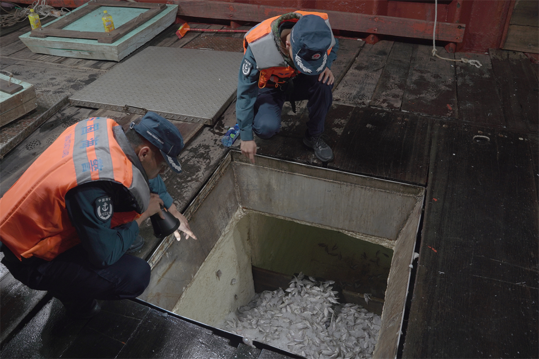 圖為海警執(zhí)法員對(duì)查獲的漁獲物進(jìn)行檢查。