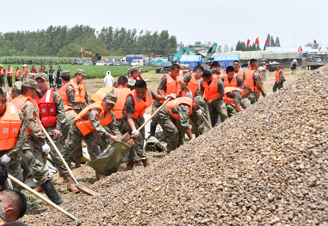 在專家指導(dǎo)下,經(jīng)過(guò)軍地?fù)岆U(xiǎn)人員緊急處置,7月8日13時(shí),管涌險(xiǎn)情得到初步控制。放眼望去,官兵和民兵們沖鋒的身影構(gòu)筑起一道“迷彩長(zhǎng)堤”。