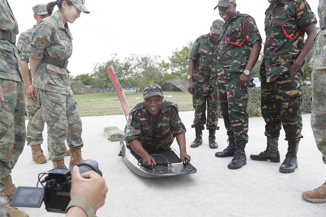 開幕儀式結(jié)束后,中方開展裝備展示活動。在中方講解員的講解下,坦方參演官兵代表體驗了水下步槍等武器裝備。多名坦方參演官兵代表聚集在無人平臺操作區(qū),對操縱無人設(shè)備表現(xiàn)出濃厚興趣。