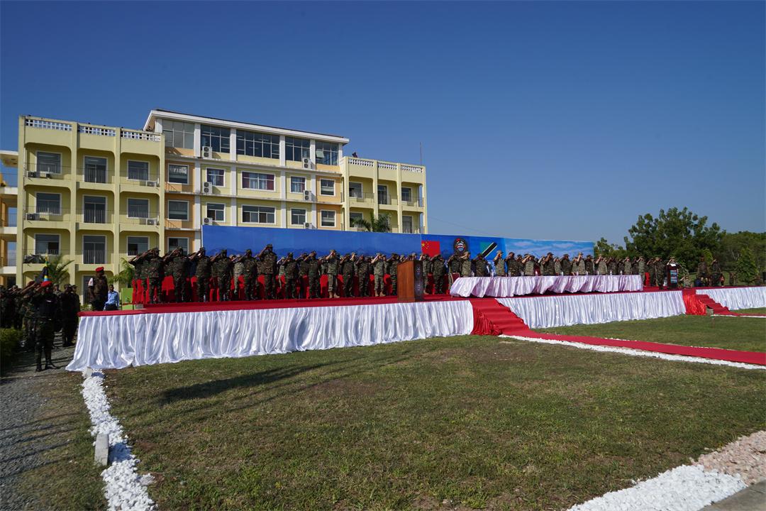 在兩國主持人介紹下,坦方軍樂團(tuán)入場,奏兩國國歌,參演官兵應(yīng)聲高歌。